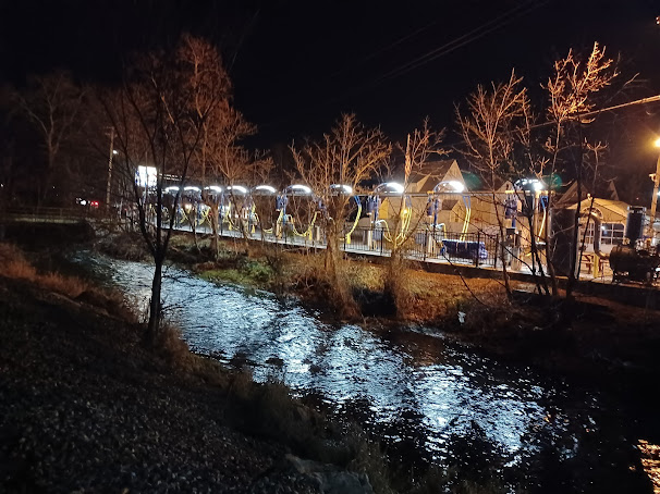 We crossed Rt 1A before reaching Warwick and crossing the creek one more time. Ambient light from the town made walking this particular stretch very pleasant. We crossed Elm Street followed by Oakland Avenue, then passed the station which was lovely with night lighting, then came to our cars across South Street.