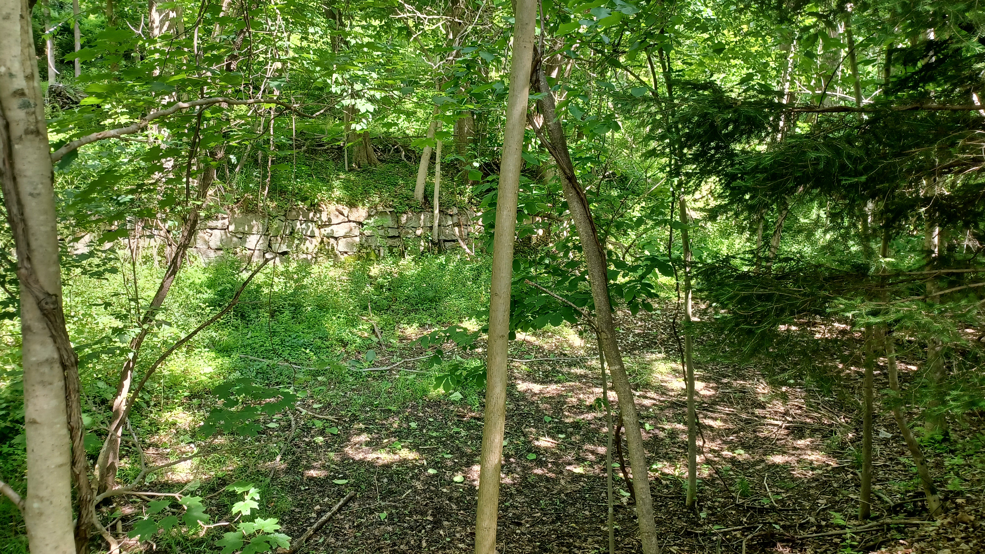 We continued ahead from here to the former site of the High Falls Aqueducts. The old canal route prism was somewhat visible just to the right of where we were walking west, and we soon reached the edge of the site, with the fine cut stone still in nice shape.