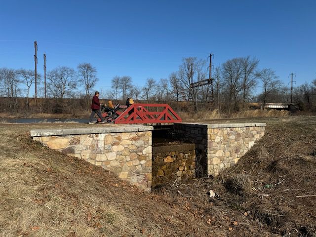 Once everyone was caught up, we continued down the canal a bit more. A train went by so we could barely see it on the former Pennsylvania Railroad as we continued.